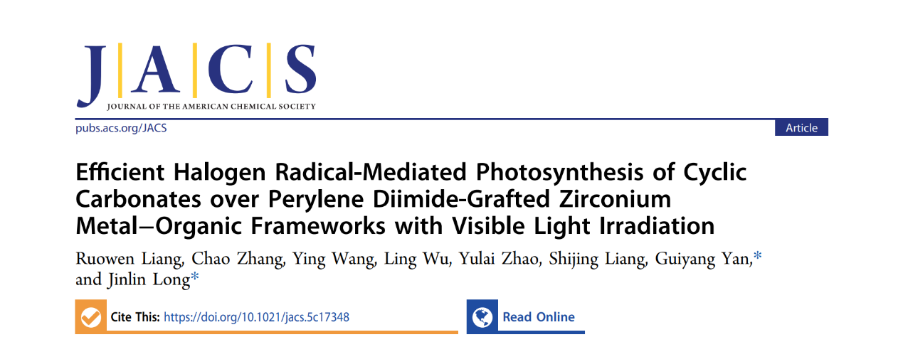 近日,星空官网颜桂炀教授、梁若雯副教授团队与福州大学龙金林教授团队合作,以星空官网为第一署名单位在国际顶级期刊《Journal of the American Chemical Society》(JACS)上发表了题为“Efficient Halogen Radical-Mediated Photosynthesis of Cyclic Carbonates over Perylene Diimide-Grafted Zirconium Metal-Organic Frameworks with Visible Light Irradiation”的重要研究成果。这是星空官网历史上首次以第一作者、第一署名单位在该期刊发表研究成果,标志着星空官网在高水平基础与前沿化学研究方面实现了历史性突破。