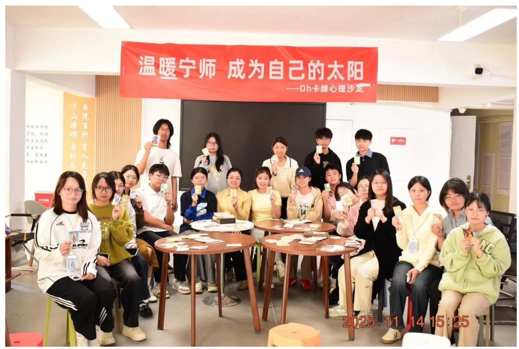 11月14日,新能源与材料学院邀请国家二级心理咨询师欧嘉烟老师,以“温暖宁师 成为自己的太阳”为主题,在学生社区第一园区开展OH卡牌心理沙龙活动。来自新能源与材料学院、旅游管理学院、医学院20余位2025级同学参加沙龙。