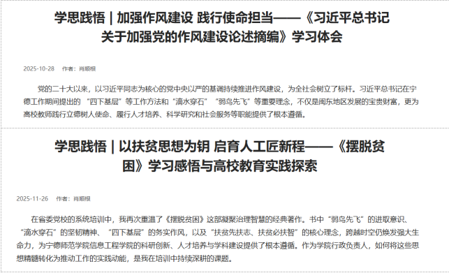 学院始终将党建作为事业发展的“红色引擎”,构建“理论学习+实践育人+廉政护航”三维体系。在“学习强国”发表《以扶贫思想为钥 启育人工匠新程——<摆脱贫困>学习感悟与高校教育实践探索》和《加强作风建设 践行使命担当——<习近平关于加强党的作风建设论述摘编>学习体会》文章2篇,在新福建发表《以信息科技赋能高质量发展》和《以博士创新站助力新质生产力》理论文章2篇,推动习近平新时代中国特色社会主义思想入脑入心;优化党支部设置,发展党员266名、培养积极分子572名,教师第一党支部获评全省党建工作样板支部,学院党委在基层党务干部职业能力大赛中斩获集体三等奖,1人获评宁德市优秀党务工作者。创新廉洁教育形式,结合专业设计廉洁图标;严格落实意识形态工作责任制,召开分析研判会12次,开展师德警示教育36次,培育课程思政示范项目37项,发布新闻报道247篇,实现党建与业务同频共振。通过专家讲座、红色基地现场教学等活动,让党建引领真正转化为师生干事创业的行动力。