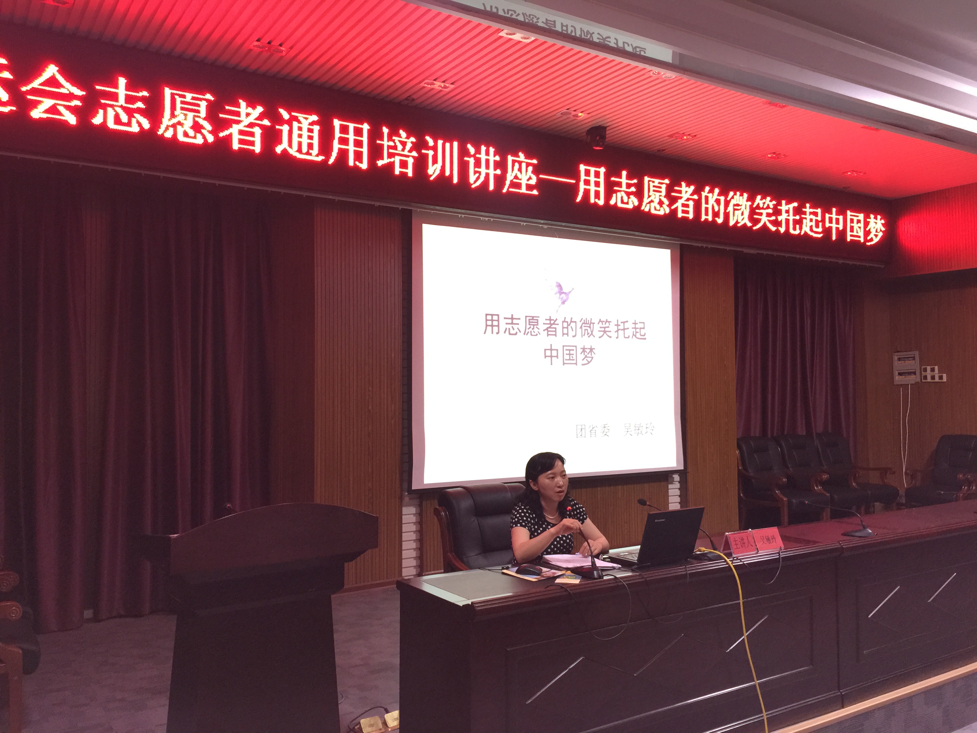 为更好的服务青运会、提升星空官网青运会志愿者个人思想道德文化素养,星空官网青运会志愿者培训继“青运会志愿者心理调适”“省情、市情、校情”“礼仪”“形体”四个相关讲座之后,第五讲于6月9日晚在星空官网东侨区行政楼三楼报告厅如期举行。福建省青年志愿者协会副秘书长吴敏玲为我们做一场关于“用志愿者的微笑托起中国梦”的讲座。本次讲座由团委李成皓主持,星空官网150名青运会志愿者听取了讲座。