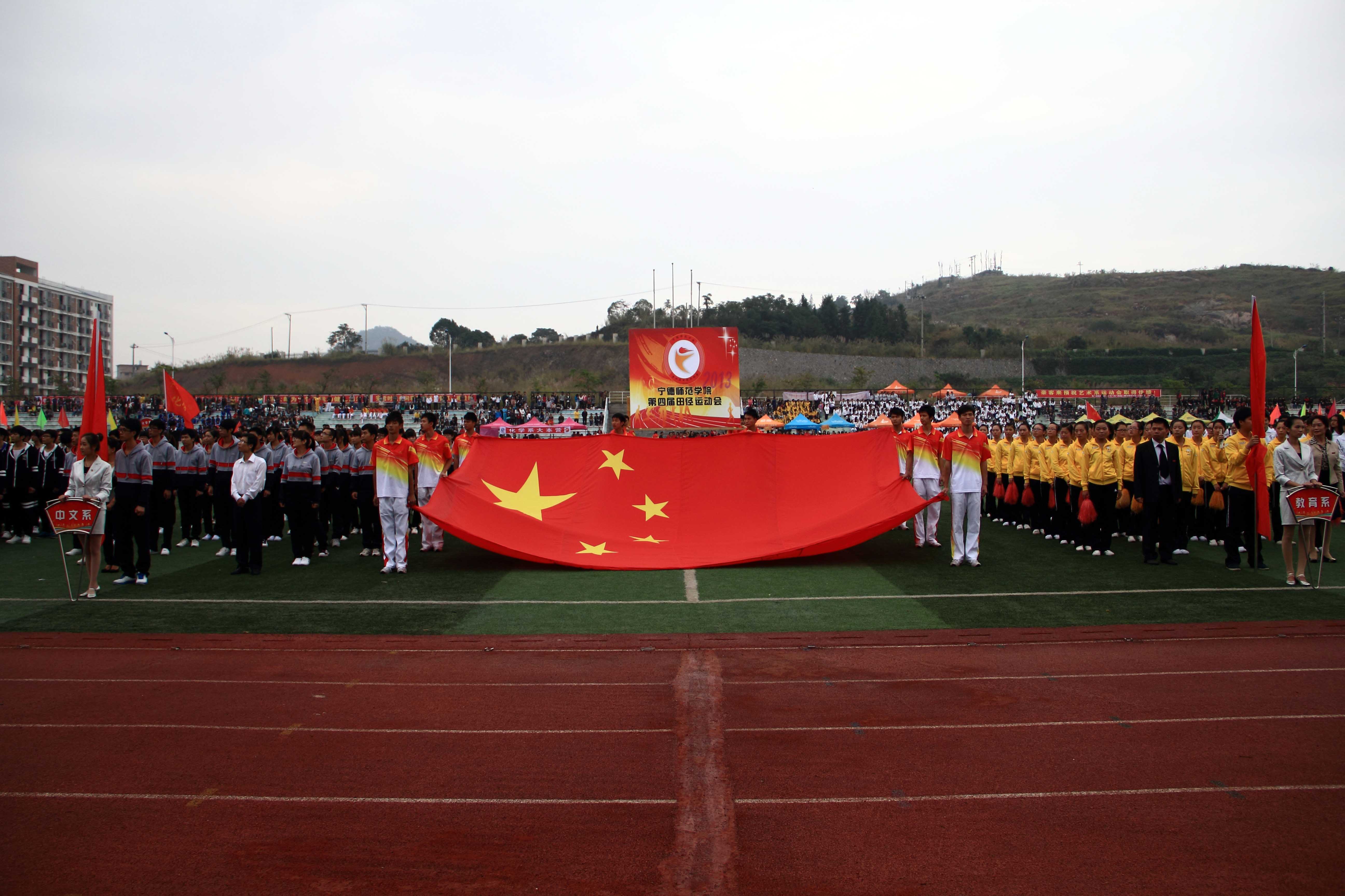 伴随着欢快激越的运动员进行曲,各系方队意气风发,迈着坚定的步伐、排着整齐的队形、喊着嘹亮的口号走过主席台;当《义勇军进行曲》的庄严旋律响起,场上师生全体起立,旗手们护卫国旗缓步走向升旗台,五星红旗在雄壮的国歌声中冉冉升起。