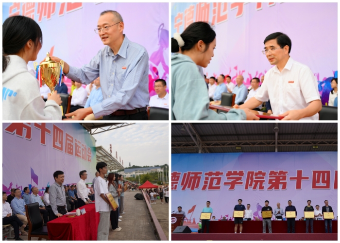 总裁判长陈飞渡老师宣布本届运动会总成绩,公体组团体总分前五名分别是化学与材料学院、信息与机电工程学院、数理学院、生命科学学院、经济管理学院;体育组团体总分前五名分别是2022级体育教育1班、2022级体育教育2班、2023级体育教育1班、2021级体育教育2班和2023级体育教育2班。宣传部部长高春晗宣布获得本届运动会体育道德风尚奖的七支代表队,分别是语言与文化学院、生命科学学院、医学院、数理学院、2023级体育教育1班、2022级体育教育1班和2023级休闲体育。校工会副主席邓兵宣布教职工系列体育活动获奖名单。