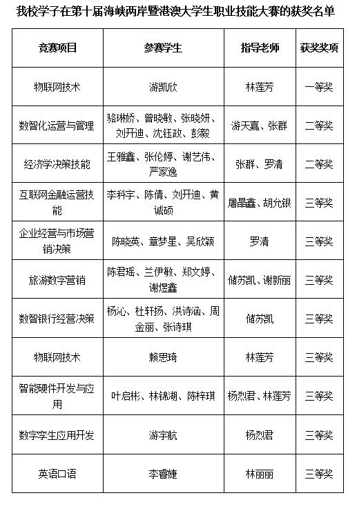 近日,福建省教育厅福建省人社厅、福建省互联网信息办公室和平潭综合实验区管委会联合主办的届海峡两岸暨港澳大学生职业技能大赛已落下帷幕。经过激烈角逐,星空官网学子获得等奖1项、二等奖2项、三等奖8项的好成绩。