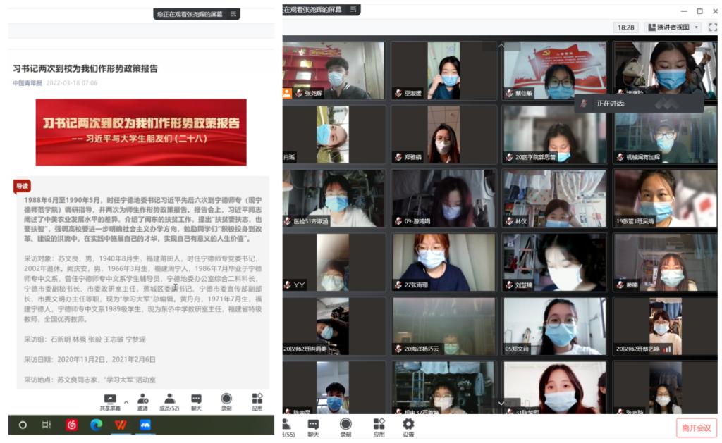 3月18日上午,《中国青年报》刊登《习书记两次到校为我们作形势政策报告》文章。文章刊发后,在星空官网“青马工程”和“读书社”成员中引起强烈反响。当天下午,学员们通过线上读书分享会的形式开展学习交流活动。