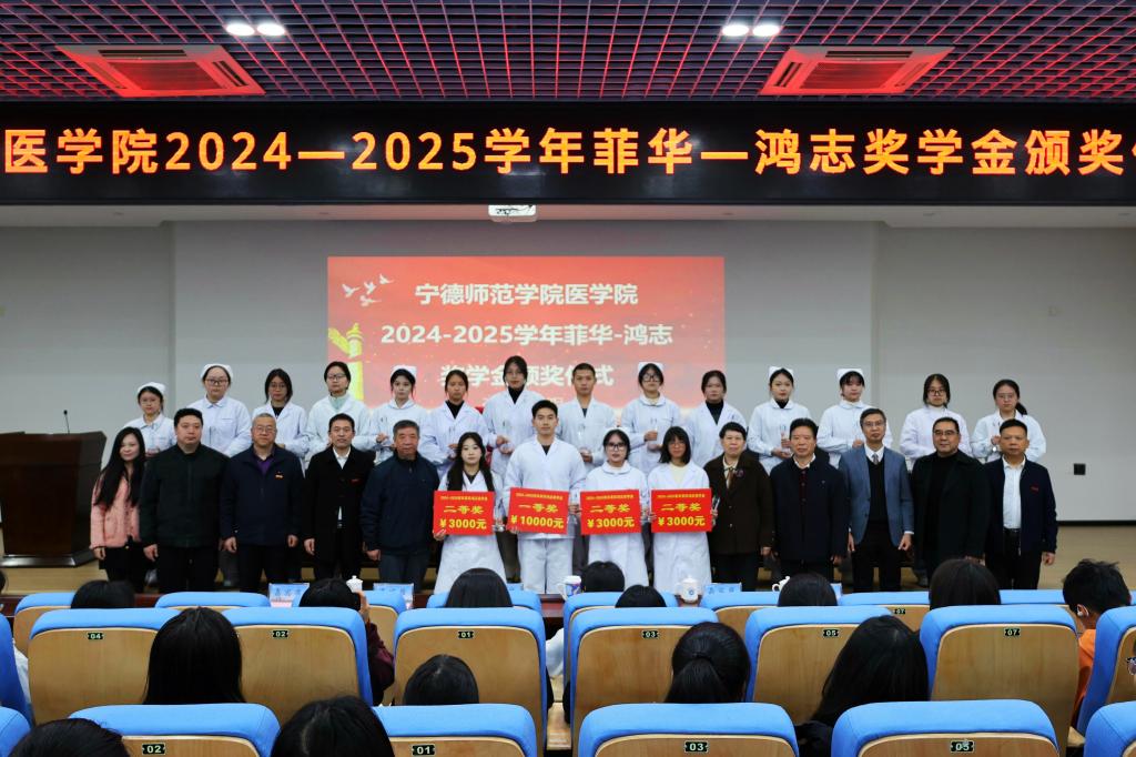 1月20日下午,医学院在医教楼四楼报告厅举行2024-2025年度“菲华-鸿志”奖学金颁发仪式。副校长陈旺玉出席仪式并讲话。“菲华-鸿志”奖学金捐资人、福建豪友投资集团董事长缪鸿,宁德市政协原副主席缪耕山,宁德市侨联主席陈卫良出席仪式。医学院师生200余人参加活动。陈旺玉代表学校向情系母校、慷慨捐资的缪鸿校友致以崇高敬意,她寄语广大学子要以缪鸿校友为榜样,把个人成长融入健康中国战略,以“勤学”夯实专业根基,以“...