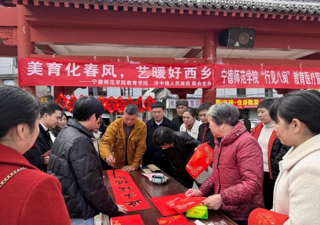 1月26日,教育学院艺术教育系师生赴宁德市蕉城区洋中镇东山村开展了春风化雨·美育浸润行活动。活动由艺术教育系主任阮蕾晔老师、公共美育科研主任王红伟老师带队,师生代表共同参与。在洋中镇好西乡广场,师生现场挥毫泼墨,书写春联与“福”字,完成一幅幅寓意吉祥的作品,并开展简易剪纸互动教学,手把手指导村民体验传统艺术。现场还收集群众对文化活动的意见建议,为后续精准化、常态化开展美育服务提供参考。在东山村半山...