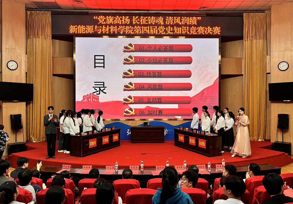 4月14日新能源与材料学院在图书馆报告厅隆重举行“党旗高扬 长征铸魂 清风润绩”第四届党史知识竞赛决赛。300余名师生代表现场观摩。经线上初赛选拔,6支队伍晋级决赛。比赛设个人必答、小组必答、抢答及风险题四个环节。赛场上,各队配合默契、你追我赶,尤其在抢答环节拼手速、比脑力,将气氛推向高潮;台下观众互动踊跃,形成良好学习氛围。最终,“初心逐梦队”斩获一等奖,“答题全队”“星火燎原队”获二等奖,“红帆领航...